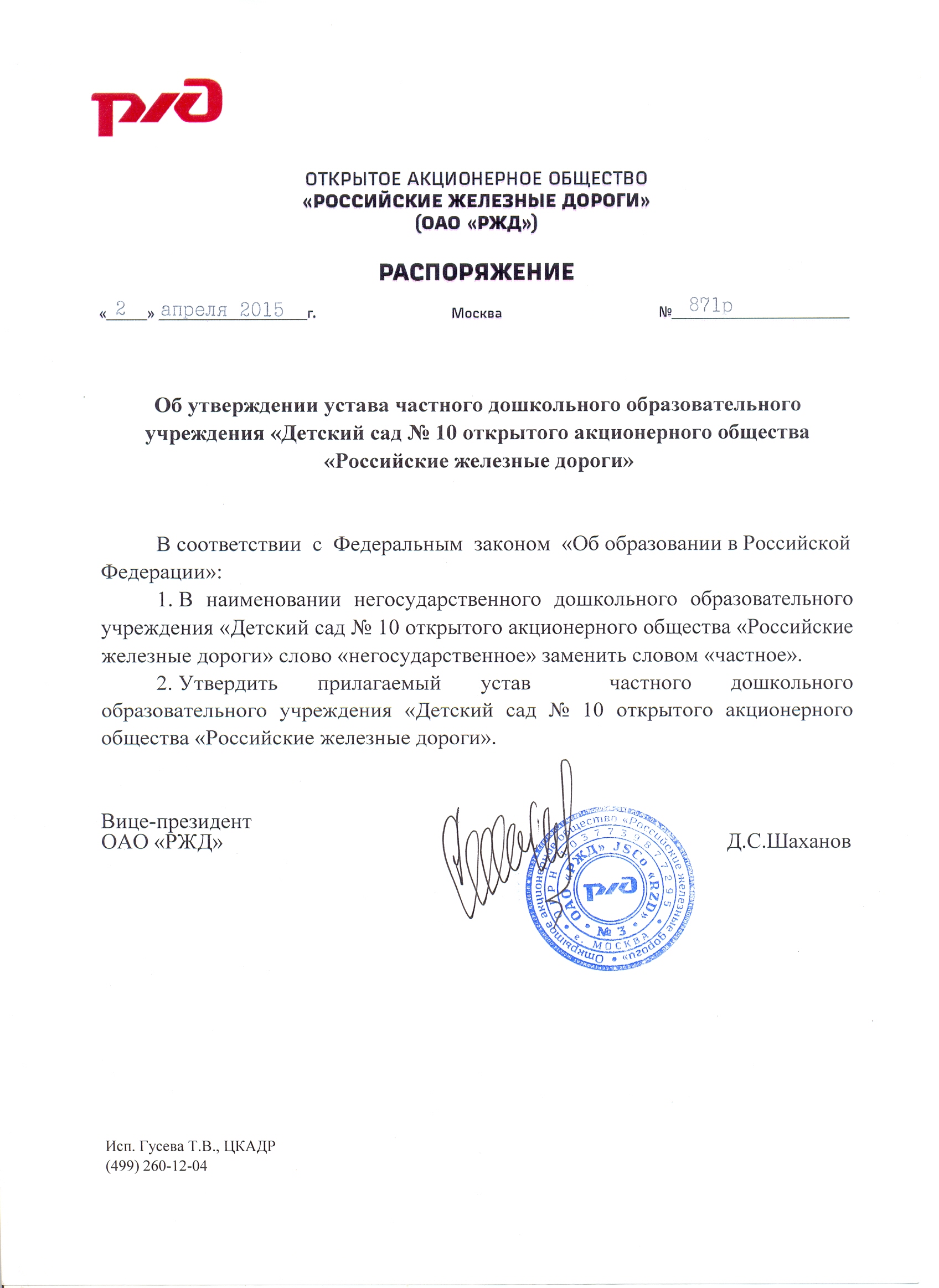Приказ об установлении стоимости и оплате услуг в Детском саду № 10 ОАО «РЖД»
